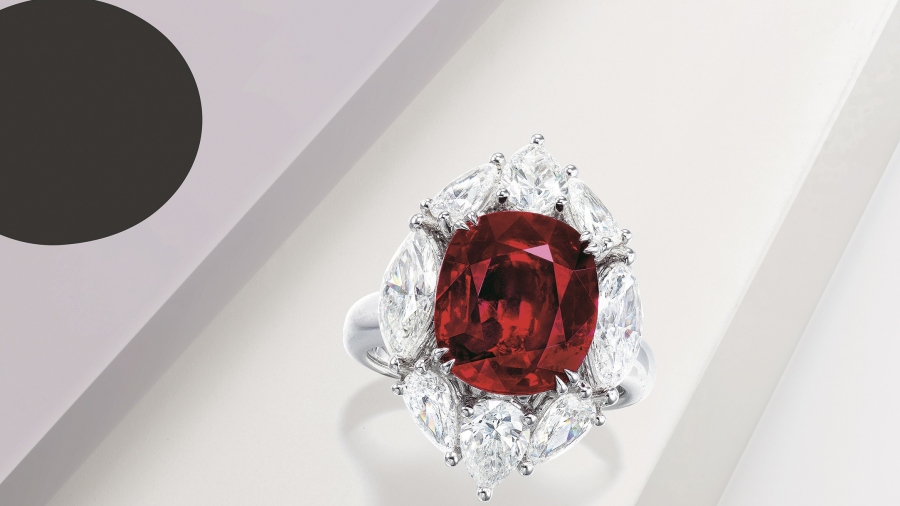 Barmský rubín s barvou holubí krví vsazený do diamantového prstenu o celkové váze 5,22 karátů vynesl 785 970 dolarů, což je těsně nad jeho nejnižším prodejním odhadem 753 736 dolarů v aukci Jewels and Jadeite.